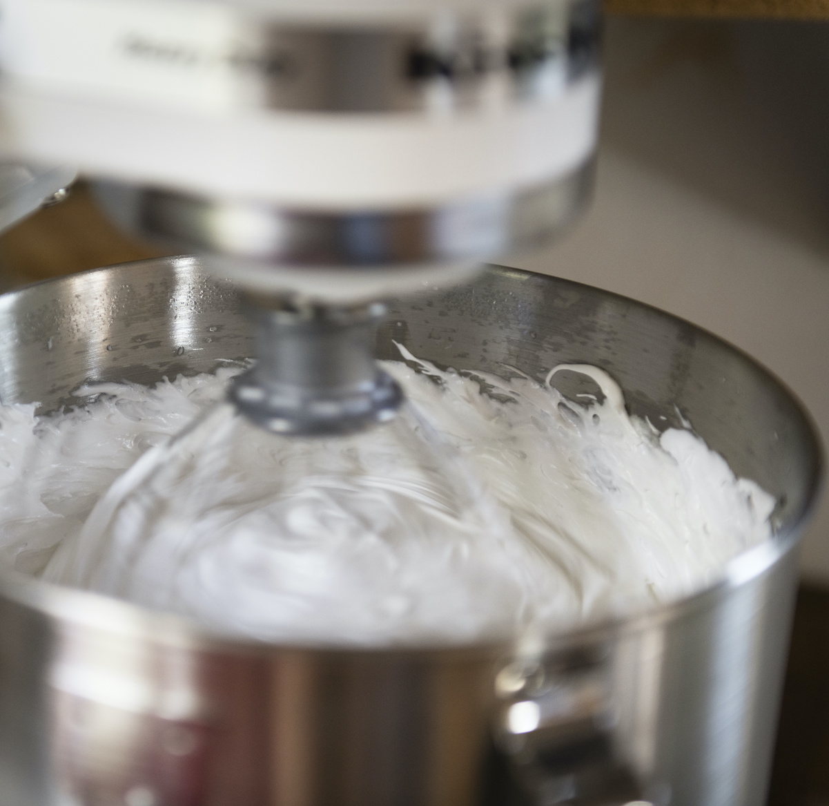 Fit the mixer with the whisk attachment, turn to low and slowly add the syrup, pouring it down the sides of the bowl – you do this so that the sugar slightly cools before it hits the gelatin (you can’t add boiling liquids to gelatin). Add the extract and the vanilla-bean seeds (or extra extract). When the syrup and flavourings are fully incorporated, gradually increase the mixer speed to high, and whip until the mixture is thick and cooled to room temperature, about 12 minutes.